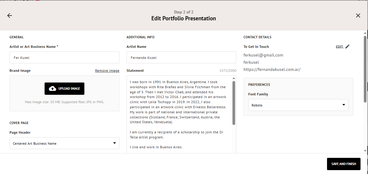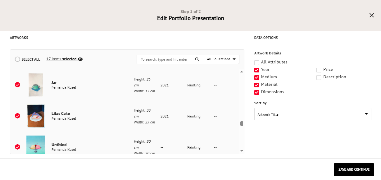 A Portfolio Presentation is a beautiful PDF presentation of Artworks featuring its' essential information (download example at the bottom of the page).